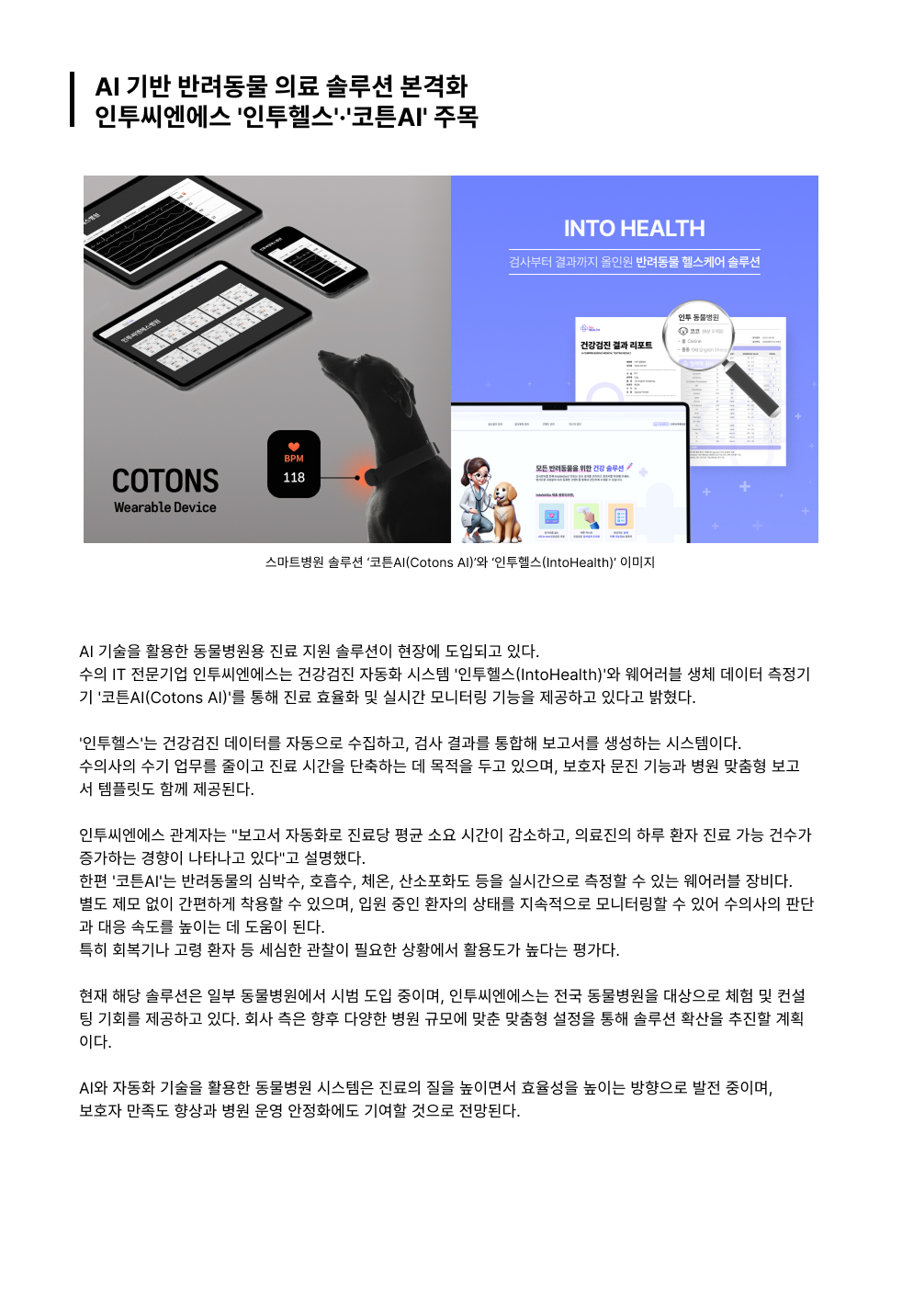 "집사님들 고민 해결"…인투씨엔에스, AI접목한 동물병원 의료 솔루션 선봬 등록일 2025-05-15 다음글 “동물병원서도 무인 키오스크 쓴다”… 인투씨엔에스 솔루션 눈길 2025-10-15 이전글 ‘EMR 1위’ 인투씨엔에스, 동물병원 행정업무 ‘디지털 전환’ 속도 낸다 -핵심솔루션 리퍼시스템, 인투싸인 눈길 2025-03-10 목록