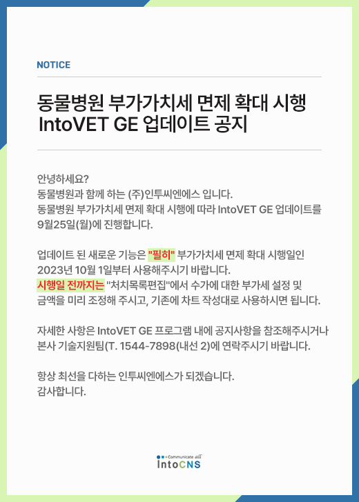 동물병원 부가가치세 면제 확대 시행 IntoVET GE 업데이트 공지 등록일 2023-09-21 다음글 CES 2023 2관왕 반려동물 웨어러블 디바이스 Sense1 정식런칭 2023-12-06 이전글 2023년 추석 연휴 기술지원팀 고객지원 업무 안내 2023-10-04 목록