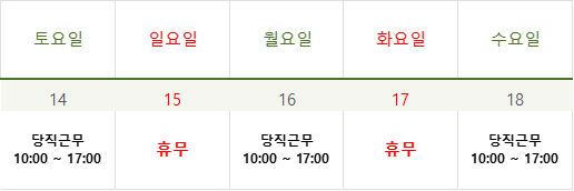 * 당직근무 일정 : 9월 14일(토) / 9월 16일(월) / 9월 18일(수) * 당직근무 시간 : 10:00 ~ 17:00 T. 1544-7898 (내선 2번)