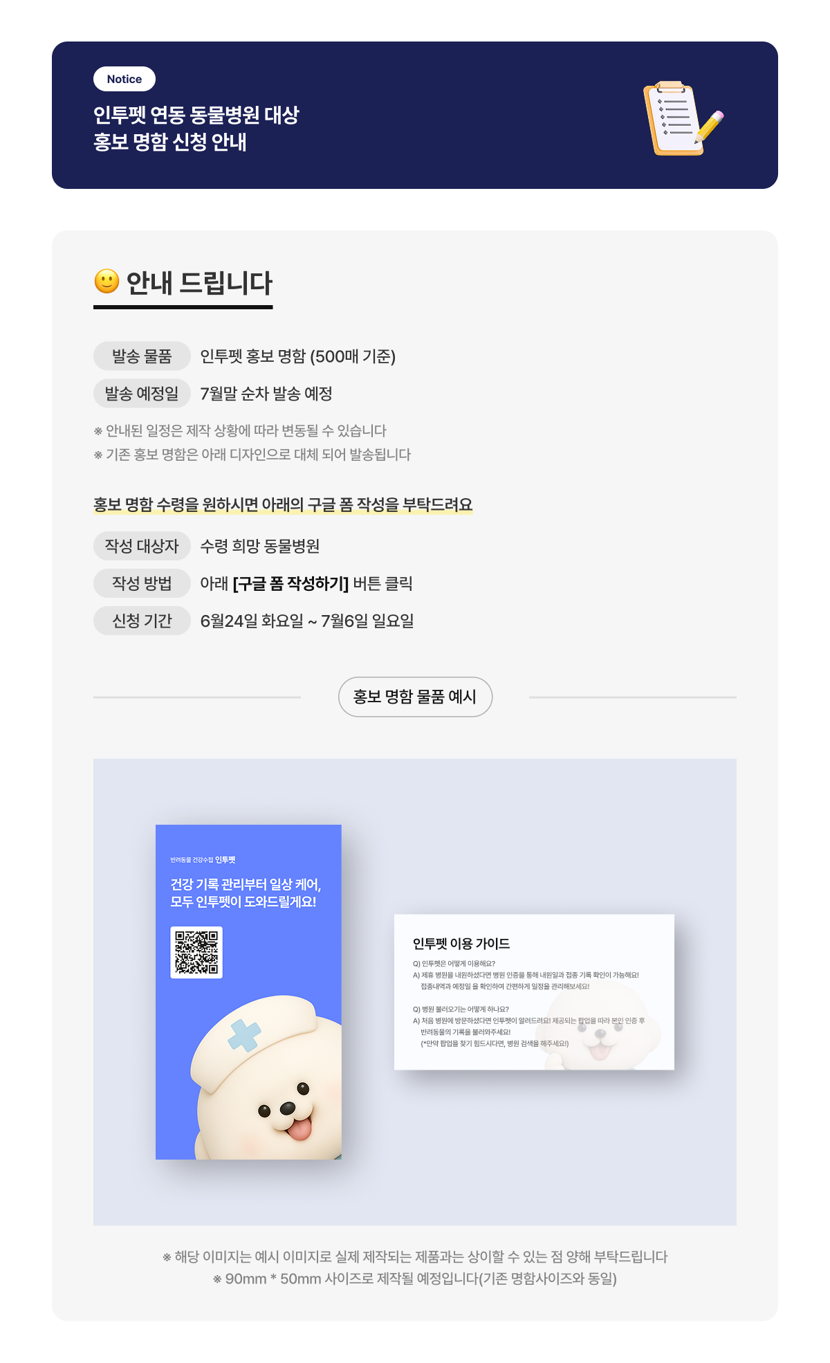 [인투펫] 인투펫 연동 동물병원 대상 홍보 명함 신청 안내 등록일 2025-06-24 구글 폼 작성하기 다음글 [인투벳x네이버예약] 지금 신청하고 광고 혜택 받으세요! 2025-07-21 이전글 [인투펫 공지] 인투펫 운영 정책에 따른 APP 설정 권한 변경 안내 2025-06-05 목록