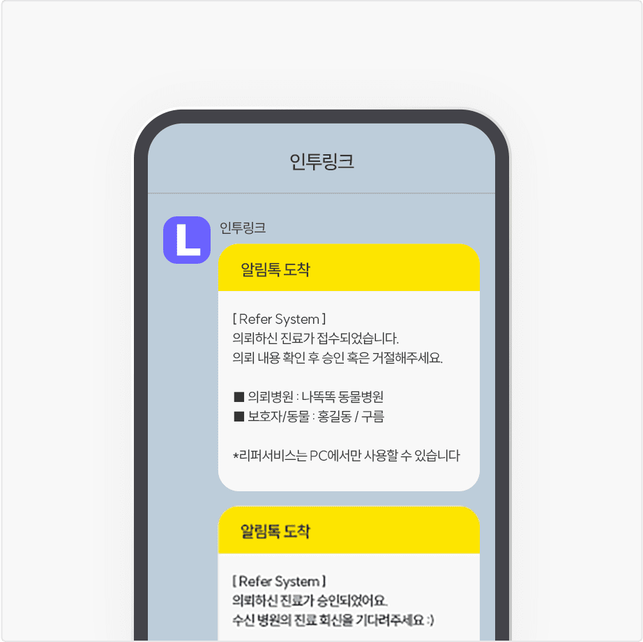 진료 내용, 검사 및 치료결과를 회송하여 최적의 동물진료 서비스 제공합니다.