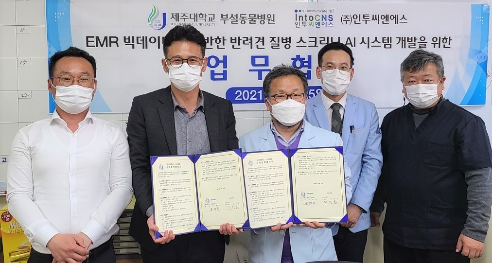 지난 4월 19일, 제주대학교 부설동물병원과 (주)인투씨엔에스가 "전자의료기록(EMR)과 데이터에 기반한 반려견 질병 스크리닝 인공지능(AI) 시스템 개발" 관련 분야의 상호 성장 발전을 위해 전략적 업무 협약을 체결했습니다